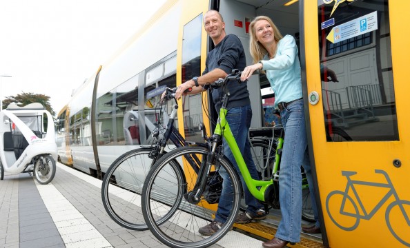 In den Zügen der eurobahn und NordWestBahn stehen im Mehrzweckbereich bis zu 10 Fahrradstellplätze je Triebwagen für Sie bereit. Der Einstiegsbereich ist von außen mit einem Fahrradsymbol gekennzeichnet. Sichern Sie Fahrräder bitte an den vorgesehenen Gurten, Packtaschen müssen abgenommen werden. Reisende mit Fahrrad bitten wir um Anmeldung im Vorfeld ihrer Fahrt. Eine Reservierung ist nicht möglich.